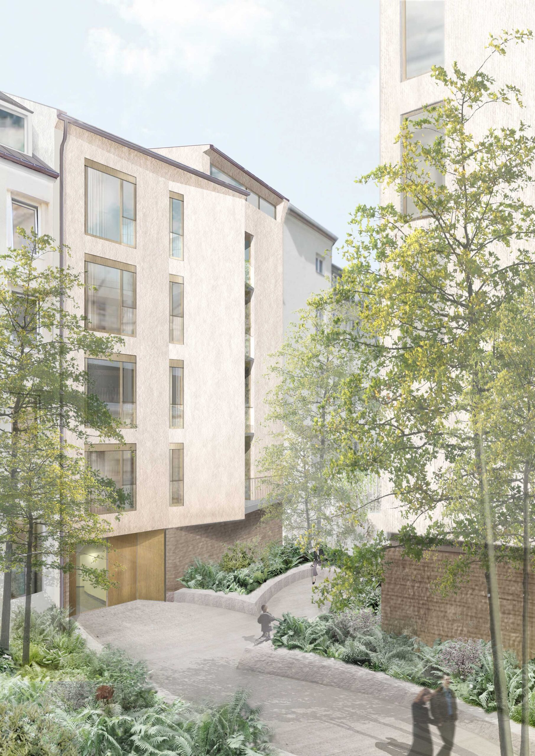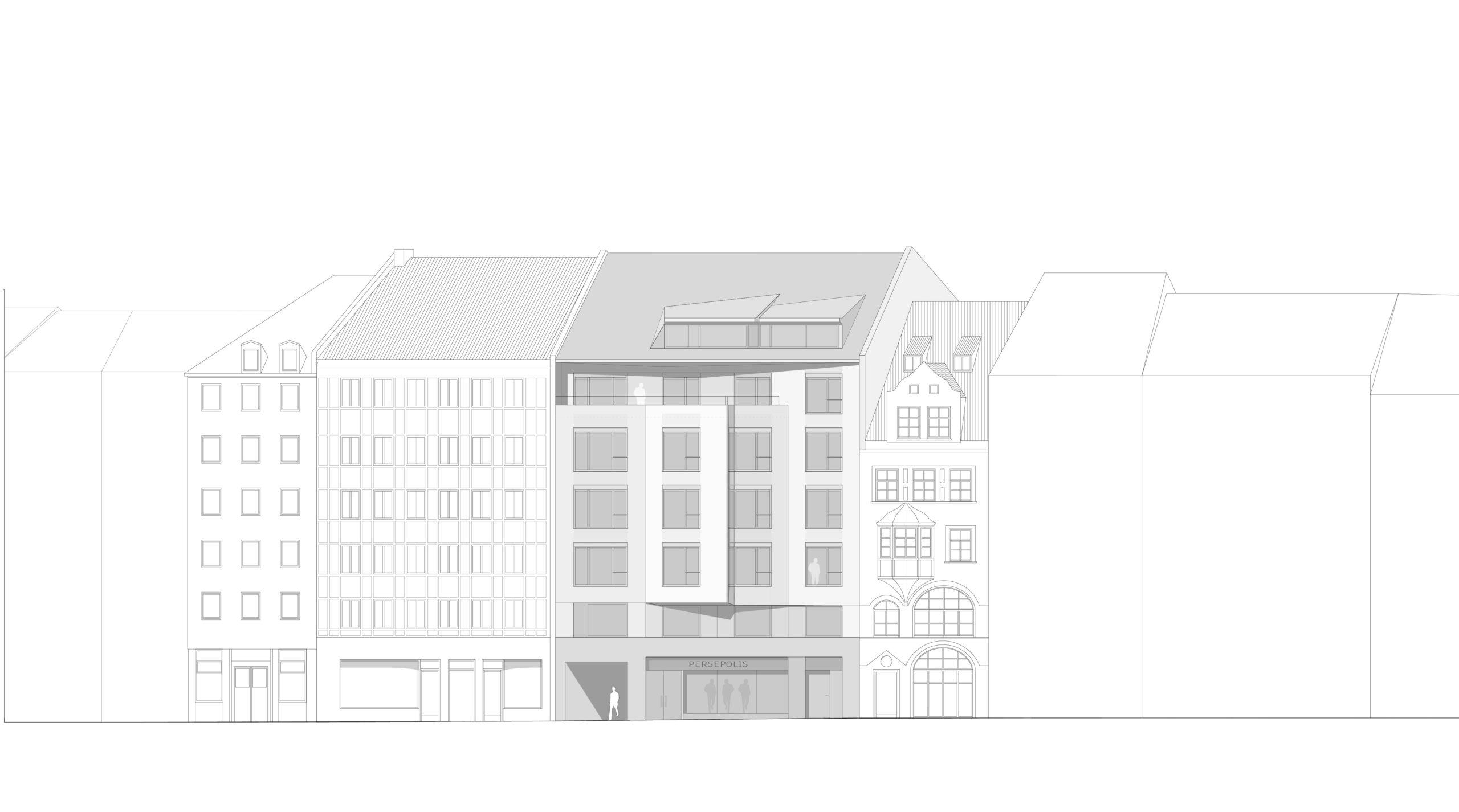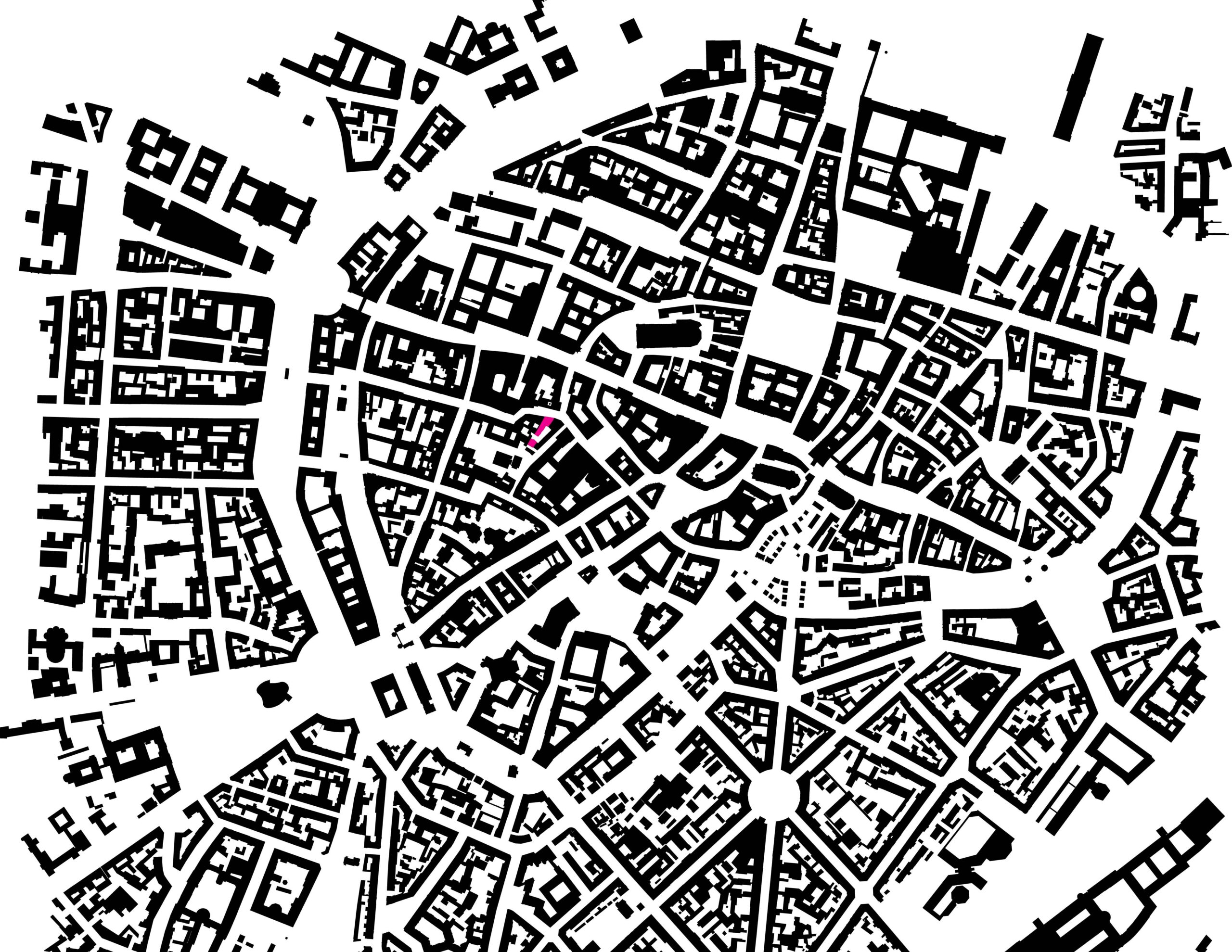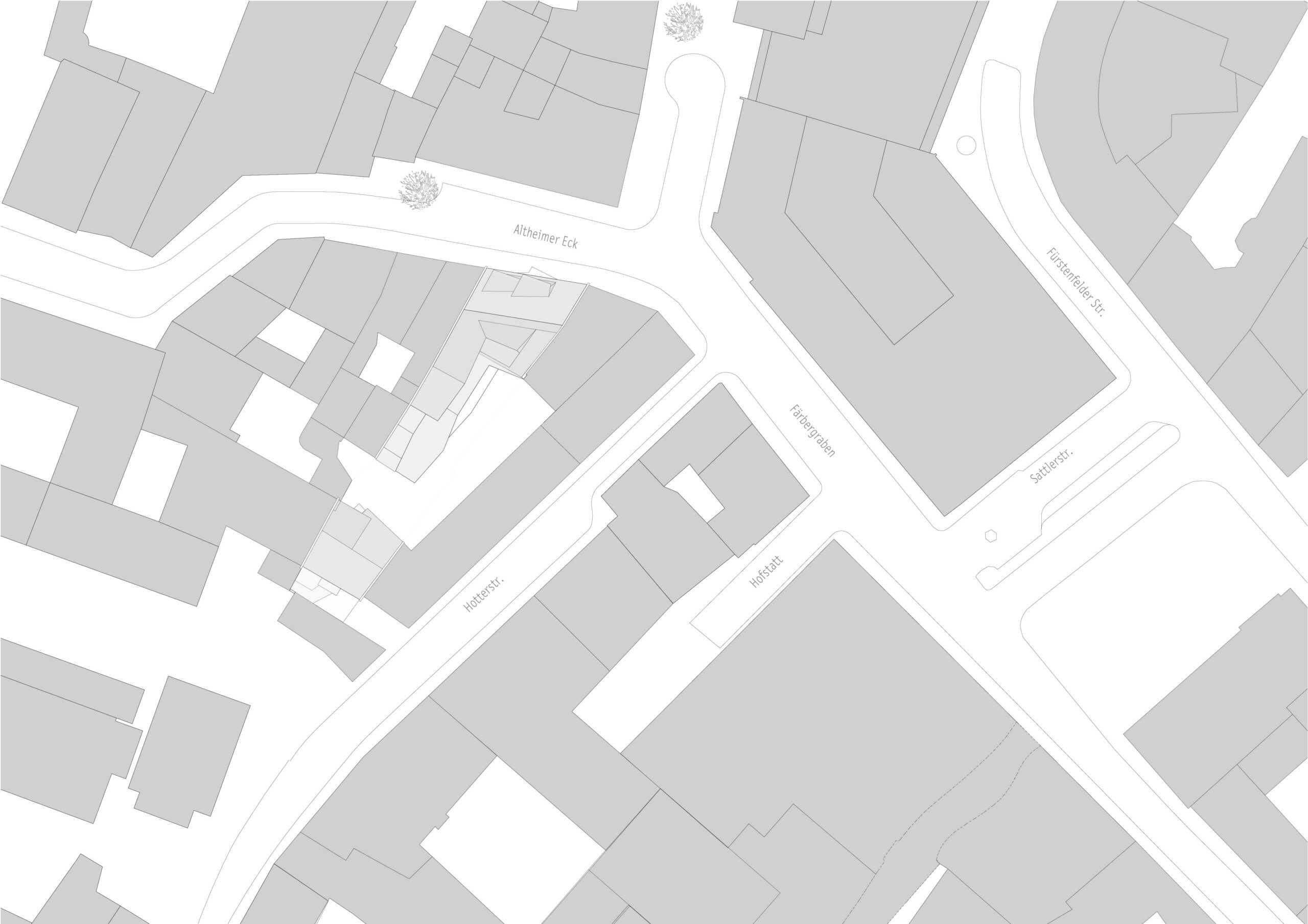 Die Parzelle und ihre Umgebung wird wesentlich von der spätmittelalterlichen, äußerst schmalen Parzellenstruktur mit großer Tiefe sowie die unmittelbare Nähe zur Klosteranlage des Damenstifts St. Anna auf der Südseite geprägt. Unser Entwurf führte zunächst die in der unmittelbaren Umgebung vorgefundene Bebauung in die Grundstückstiefe fort und orientierte sich dabei im wesentlichen an dem durch die Nachbarbebauung vorgegebenen und durch Baugrenze bzw. Baulinien ordnungsrechtlich nachgezeichneten historischen Baufeld.