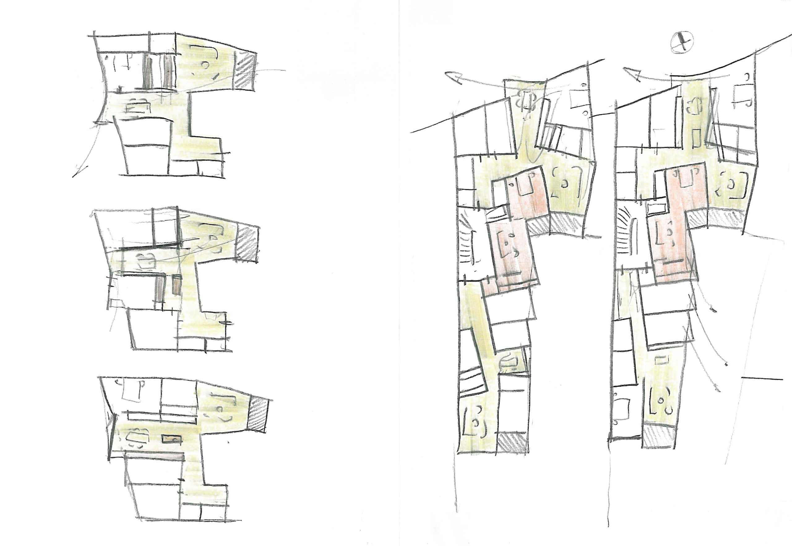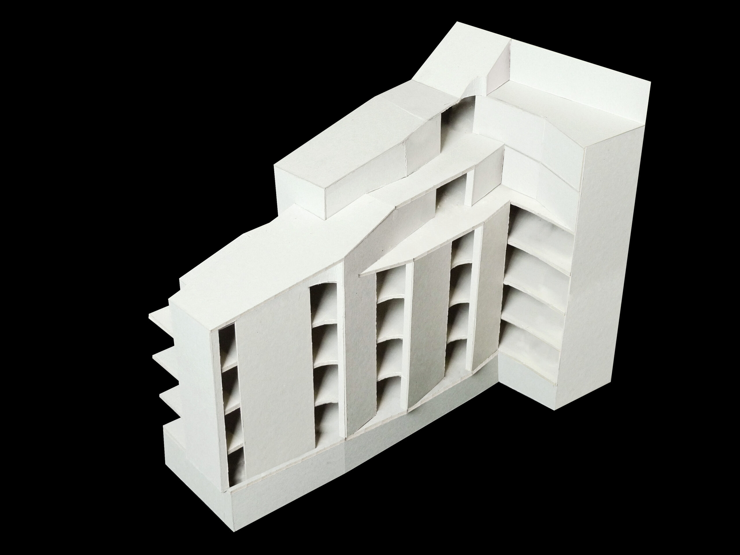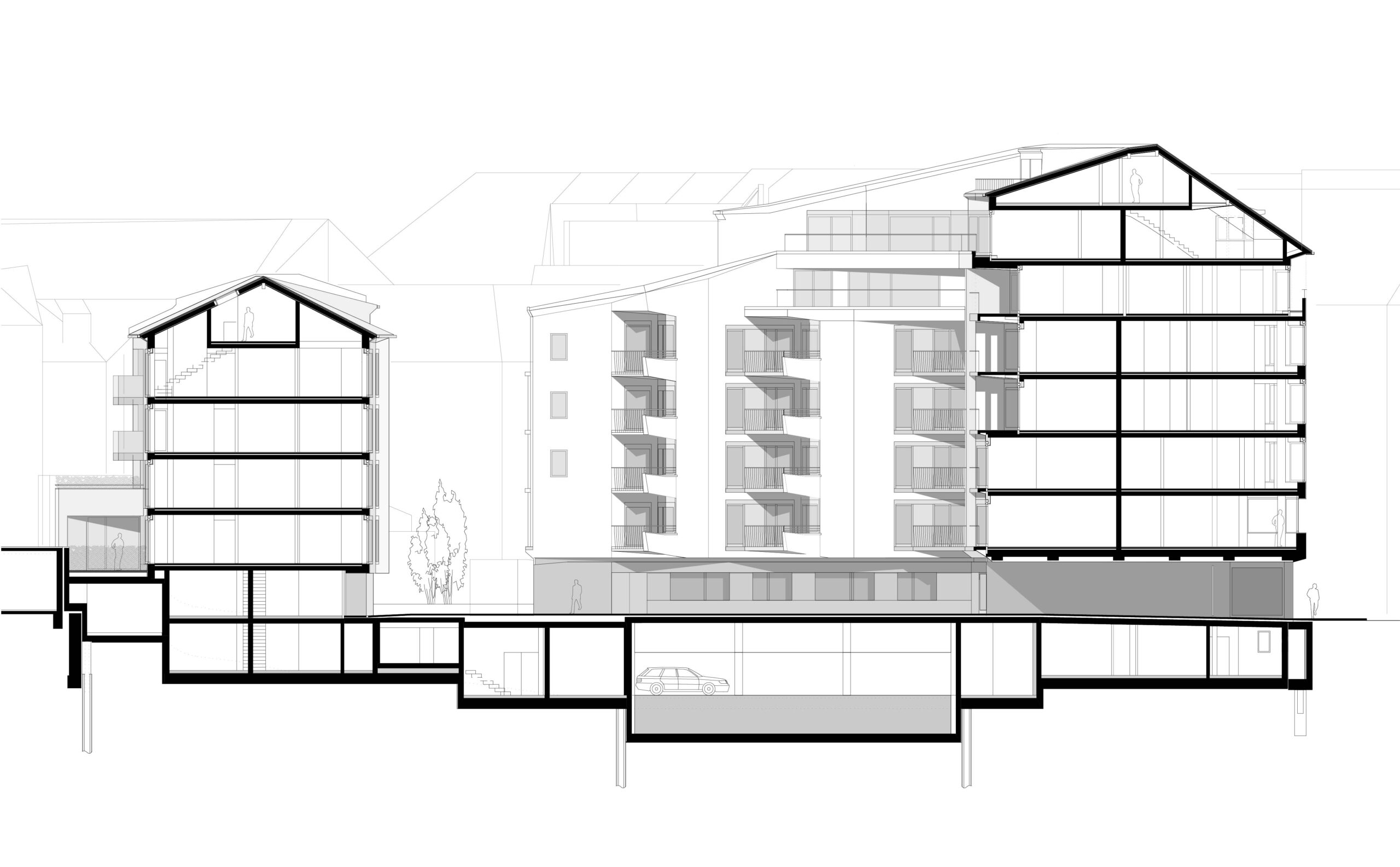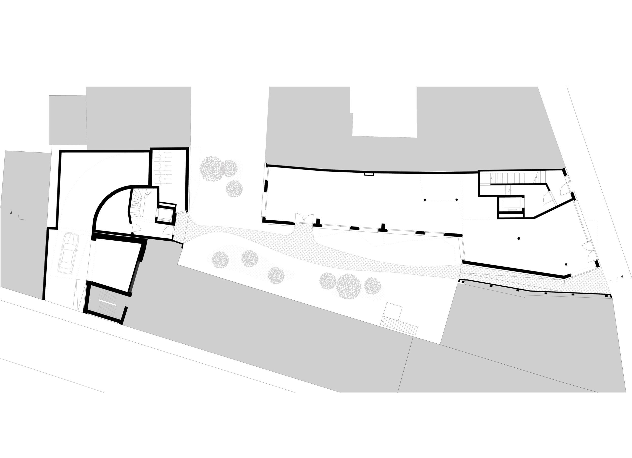 Die Parzelle und ihre Umgebung wird wesentlich von der spätmittelalterlichen, äußerst schmalen Parzellenstruktur mit großer Tiefe sowie die unmittelbare Nähe zur Klosteranlage des Damenstifts St. Anna auf der Südseite geprägt. Unser Entwurf führte zunächst die in der unmittelbaren Umgebung vorgefundene Bebauung in die Grundstückstiefe fort und orientierte sich dabei im wesentlichen an dem durch die Nachbarbebauung vorgegebenen und durch Baugrenze bzw. Baulinien ordnungsrechtlich nachgezeichneten historischen Baufeld.