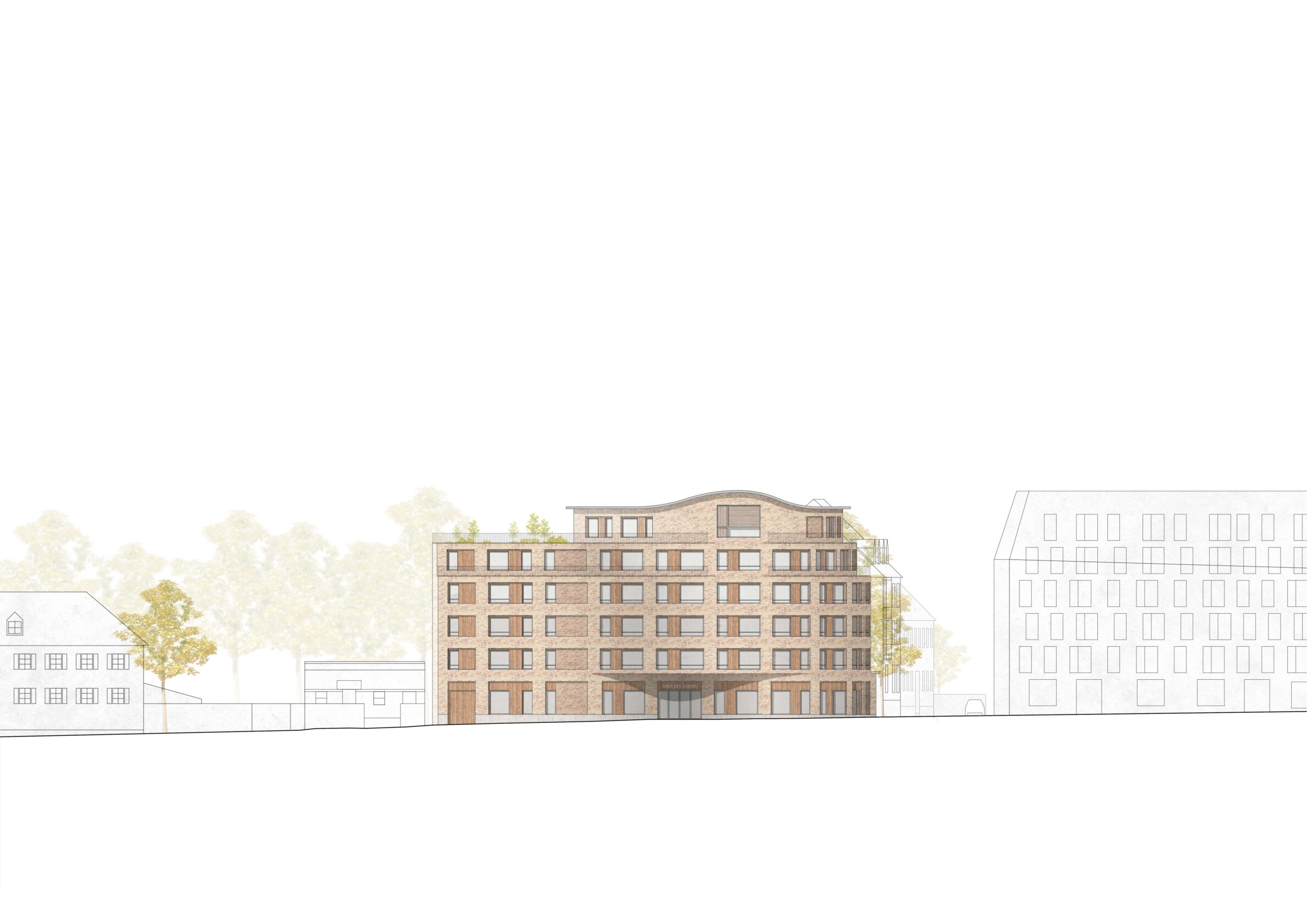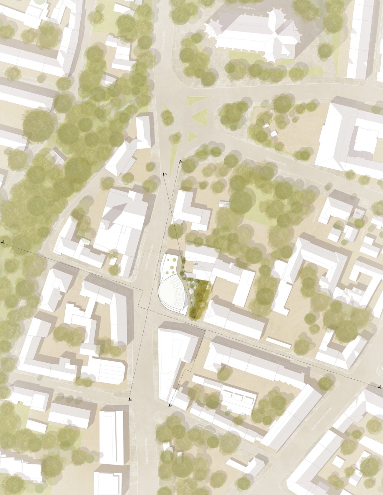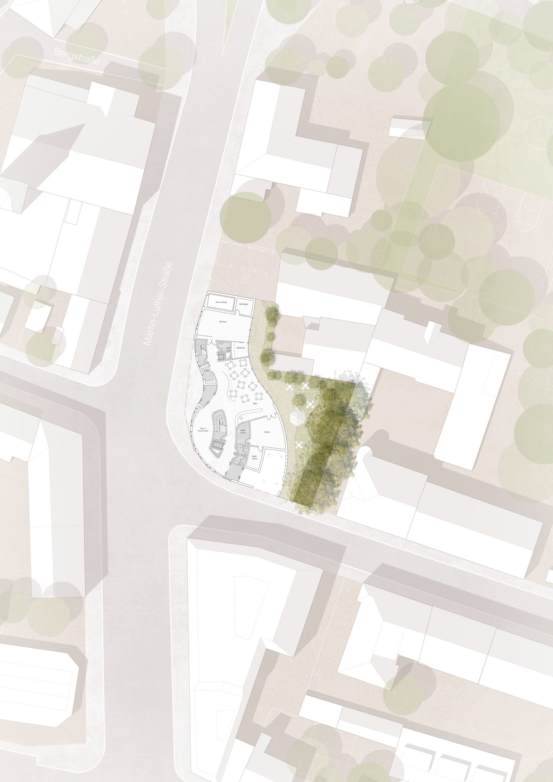 Entsprechend nimmt unser Entwurf das prägende Element des Grundstücks, die Krümmung entlang der Grundstücksgrenze auf und entwickelt daraus die Fischbauch-Struktur des Gebäudes. Die straßenseitige Krümmung legt schützend die Finger um die sich zum Hof und zum alten Baumbestand hin öffnenden Zimmer. Die geschwungenen Kurven halten die Bezüge der einzelnen Räume justierbar und bilden damit die ebenso einfache wie robuste Grundstruktur des Entwurfes. Sie ermöglicht es, die schützende und gleichzeitig verbindliche Geste im weiteren Prozess gemeinsam weiterzuentwickeln und auf diesem Weg externe wie interne Einflüsse aufnehmen zu können, ohne das Gesamtkonzept zu gefährden.