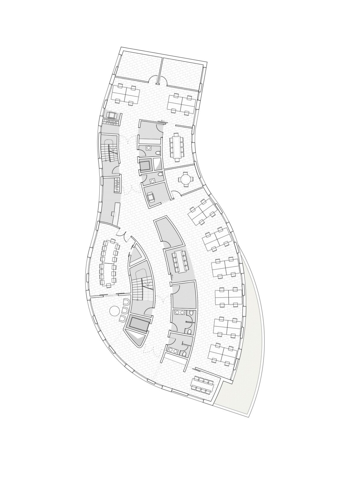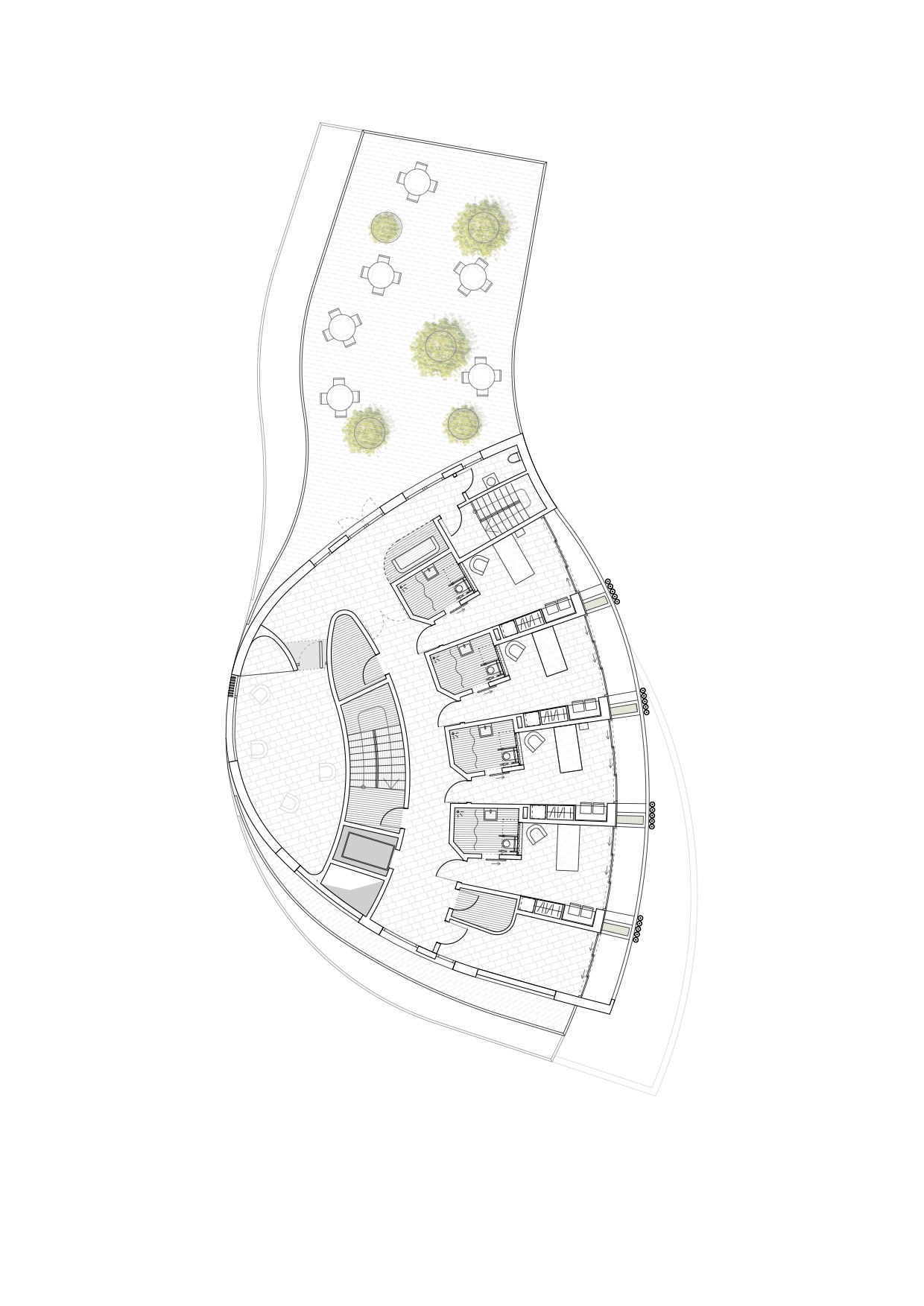 Durch diese Struktur der schwingenden Bänder entstehen auch im Inneren Räume, die nie abschließend oder hermetisch wirken, sich stets nach außen hin weiten und am Ende einen Ausweg andeuten. Während sich in den Regelgeschossen die bereits beschriebenen Finger der dienenden Funktionen schützend, um die zum Hof hin orientierten Patientenzimmer legen, ist das Erdgeschoss offen angelegt, es ermöglicht und fördert das Verbindende zwischen Café, Seminar, Ausstellung, Ankunft und Abschied. Nach oben über den Dächern weitet sich im Raum der Stille der Blick zurück über die Isarhangkante und die Stadt nach Westen.