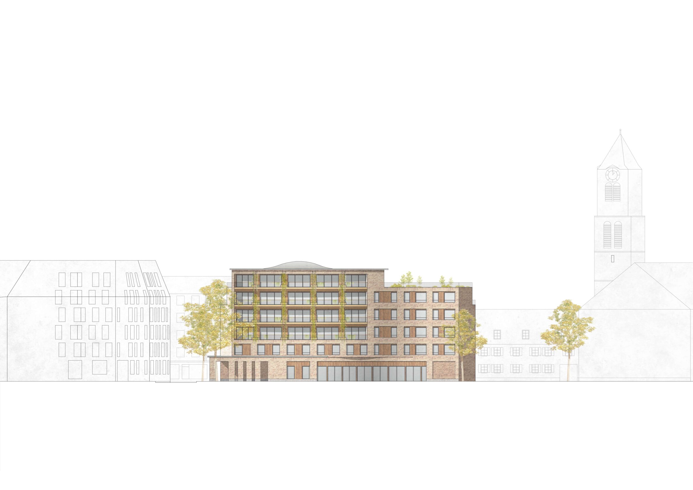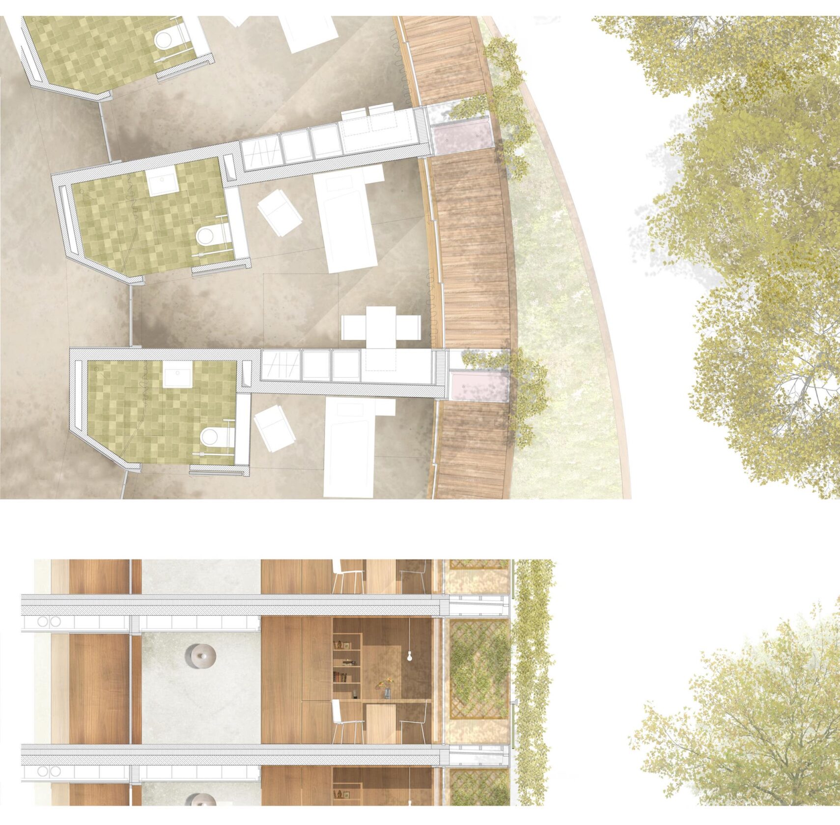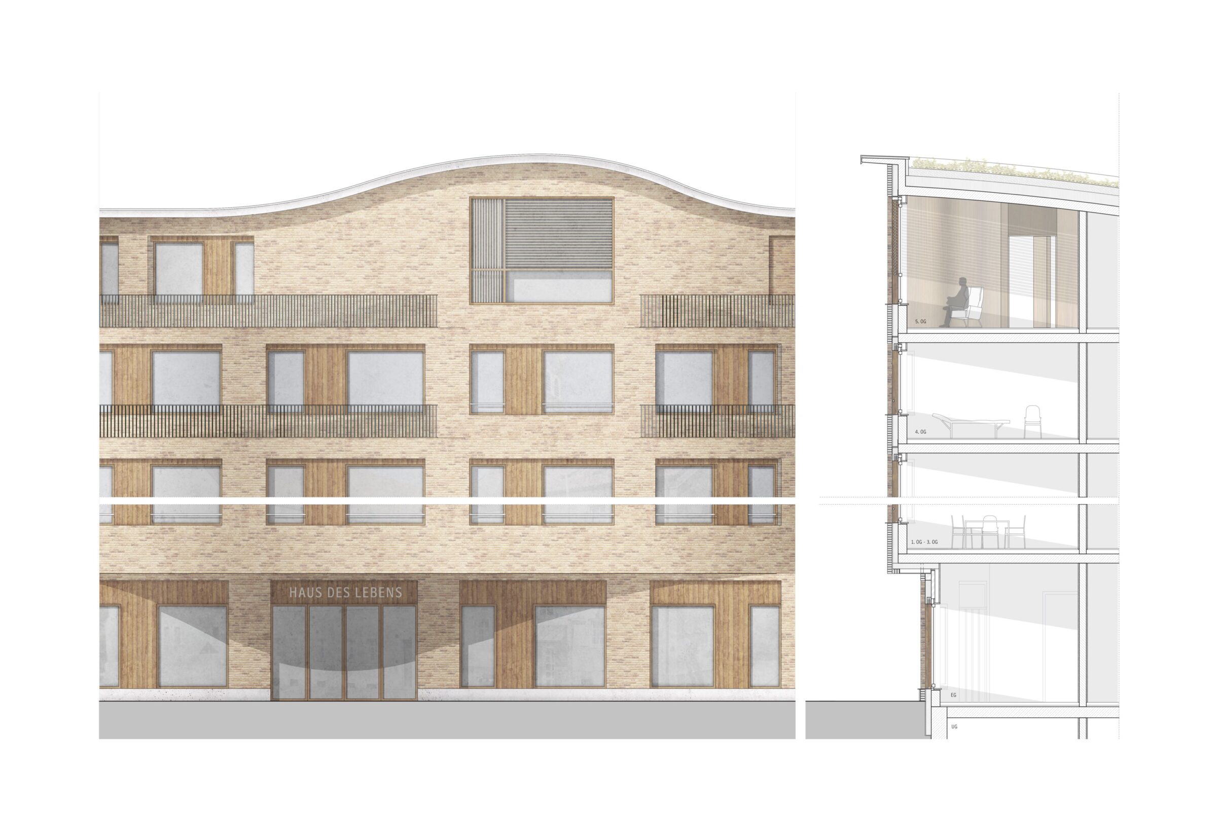 Die Zimmer selbst suchen den Dialog mit der Natur. Die Geräusche der Stadt dringen nur noch leise in den Hof. Wie die gesamte Gebäudestruktur öffnen sich auch Zimmer über die Loggia und den Hofraum hinweg zu den Kronen des alten Baumbestandes. Sie ermöglichen es den Blick und die Gedanken schweifen zu lassen und dennoch bei sich zu sein. Die Gebäudehülle trägt in Ihrer Ausprägung diese beiden Wesenszüge in sich. Zur Straße hin dominiert das schützende der Hand durch die Klinkerfassade. Das Prätentiöse, zerbrechliche Innere wird nur in den Öffnungen als dahinter verborgenes, hölzernes Gitter spürbar. Zum Hof hin, im Bereich der Patientenzimmer tritt das hölzerne der Balkone nach außen. Rau und gleichzeitig weich, sich verändernd, alternd, dennoch beständig, begrünt. Im Dialog mit den Bäumen gegenüber. Teil eines natürlichen Kreislaufs.